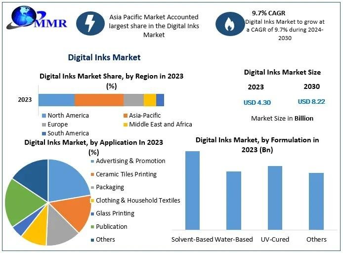 The global Digital Inks Market was valued at USD 4.30 billion in 2023 and is projected to reach approximately USD 8.22 billion by 2030, expanding at a CAGR of 9.7% during the forecast period (2024–2030).